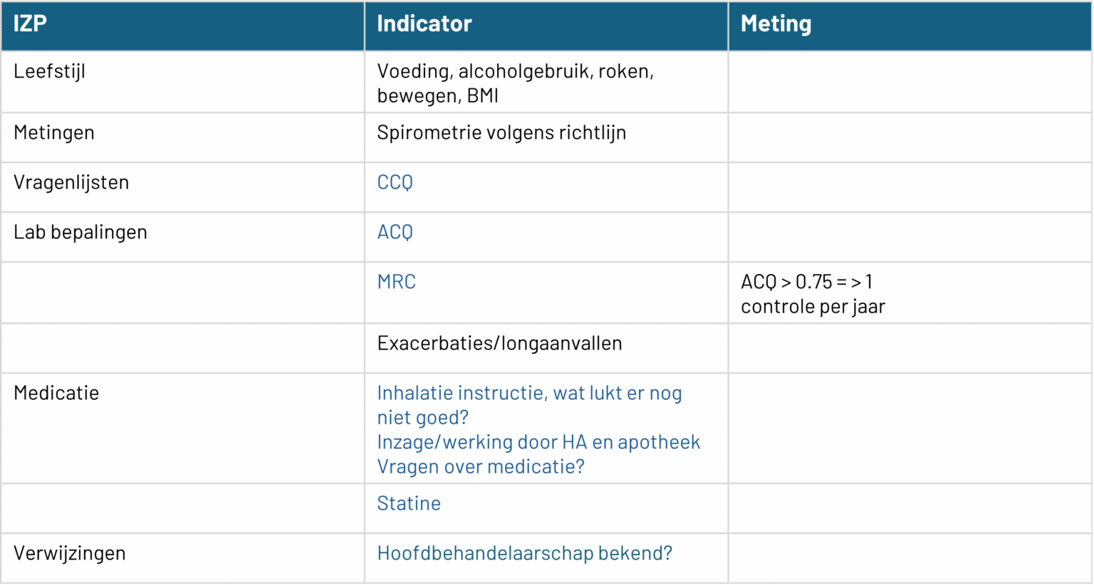 Onderstaand tabel geeft in blauw weer welke indicatoren per keten jaarlijks belangrijk zijn om op te meten of na te vragen. De andere indicatoren zijn facultatief en kunnen indien nodig gemeten of uitgevraagd worden.