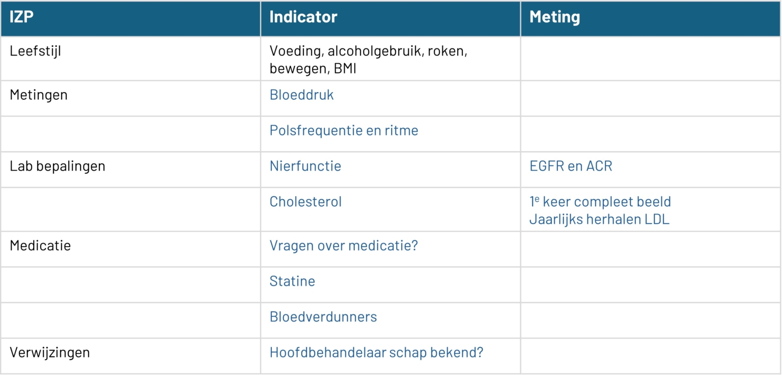 We gaan uit van een beperkt aantal indicatoren (blauw) die prioriteit hebben tijdens het consult. Andere indicatoren zijn facultatief. Afhankelijk van de situatie van de patiënt kunnen deze indicatoren worden uitgevraagd of gemeten. Daarnaast kunnen een aantal standaard indicatoren uit het HIS worden gegenereerd. Door minder “vinken” ontstaat tijd en ruimte om een “ander” persoonsgericht gesprek te voeren met de patiënt. De NHG standaard blijft in principe leidend.